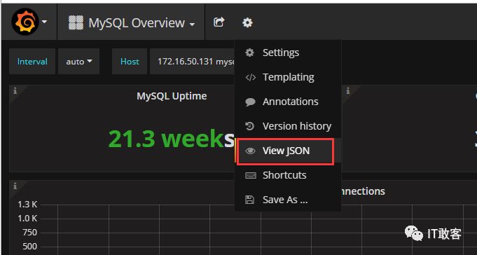 接着我们继续打开之前的 MySQL_Overview 的 dashboards,然后调整一番自己喜欢的样式,重新配置各监控项的参数,使得都有数据显示。这时,我们点击设置下面的一个 view json 就可以找到模板文件的 json 内容了,复制出来所有 json 内容,然后在/var/lib/grafana/dashboards 目录下新建一个 MySQL_Overview-copy.json 文件,将复制的内容贴进去,最后在文件的底部修改为”title”: “MySQL Overview Copy”,这样是为了便于区分之前的 MySQL Overview。