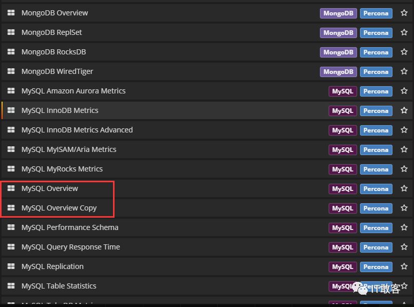 接下刷新一下 grafana 界面,看一下 dashboards 下面是不是多了一个 MySQL Overview Copy 出来,点击它,里面的格式是不是你之前配置好的格式!