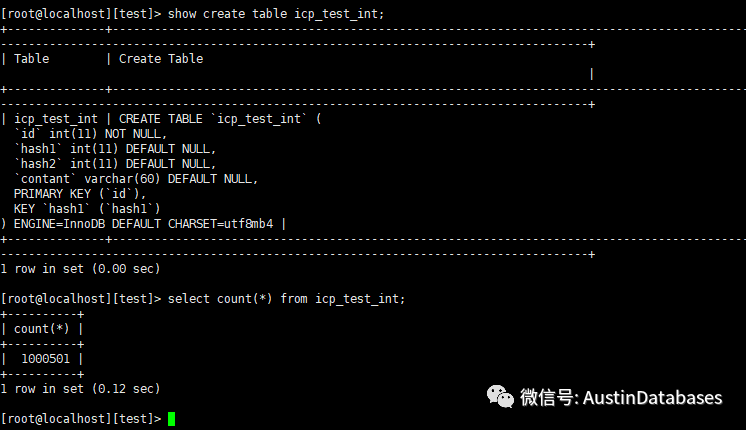 1 我们使用下面的表来做一个实验,下面的两张图说明的表结构,数据量,以及查询到底有么有走ICP,显然是走了ICP