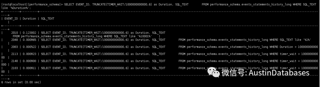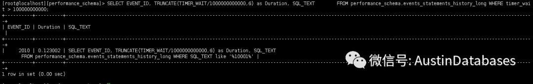 SELECT EVENT_ID, TRUNCATE(TIMER_WAIT/1000000000000,6) as Duration, SQL_TEXT FROM performance_schema.events_statements_history_long WHERE timer_wait > 100000000000;