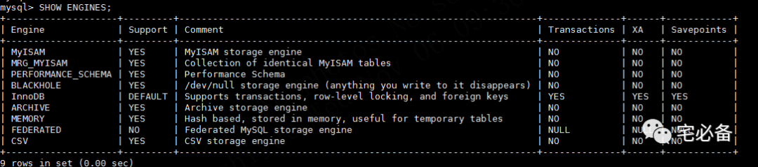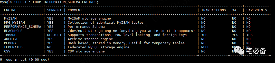 该表提供存储引擎相关的信息,主要用来确认数据库是否支持该存储引擎以及是否是默认的