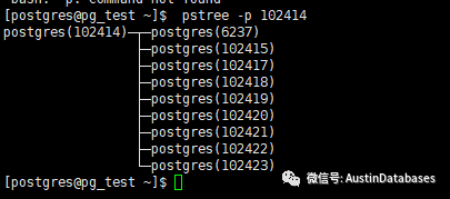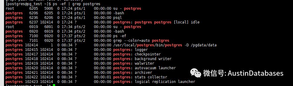 postgres 102415 102414 0 08:34 ? 00:00:00 postgres: logger
