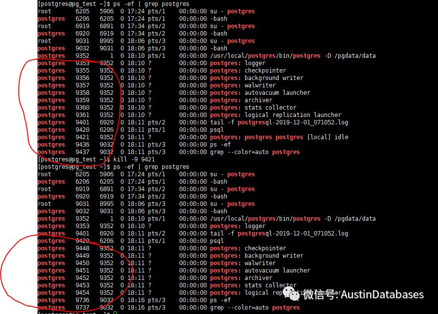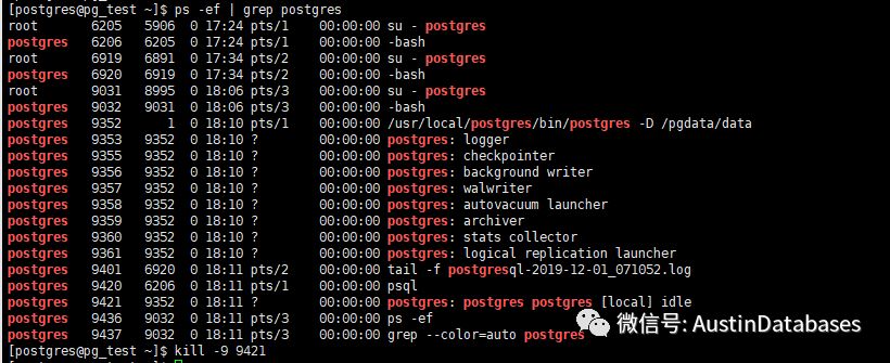 那么我们翻过来的看一下,在kill -9 一个用户连接的process后会发生什么