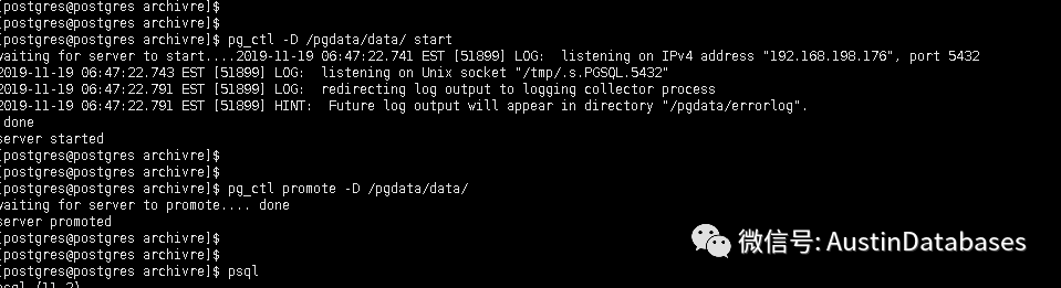 2 对176 进行promote 操作,模拟主库失效,从库接替主库,此时主库和从库之间不再有任何关系 (需要修改176 的 postgresql 的监听地址,这点是基础就不再提了)