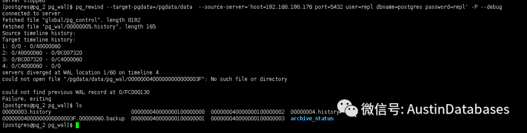结果失败,通过失败可以证明,如果主从失败后,想直接通过提升当前从库的方法,在通过 pg_rewind 进行数据同步的想法可以凉快去了