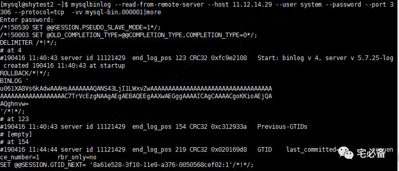 mysqlbinlog --read-from-remote-server --host 11.12.14.29 --user system --password --port 3306 --protocol=tcp -vv mysql-bin.000001