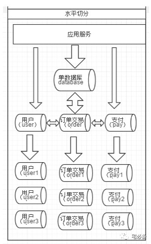 简单来说,我们可以将数据的水平切分理解为是按照数据行的切分,就是将表中的某些行切分到一个数据库,而另外的某些行又切分到其他的数据库中,如图: