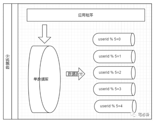 如图,切分原则都是根据业务找到适合的切分规则分散到不同的库,下面用用户 ID 求模举例: