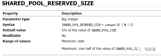 语法: SHARED_POOL_RESERVED_SIZE = integer [K | M | G]