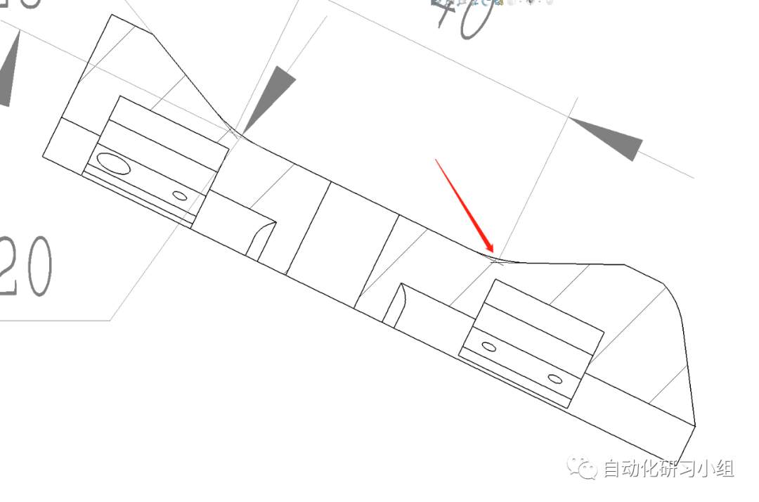 2.箭头所指处的延长线焦点怎么做:同时选中两条边后点“草图”内的点