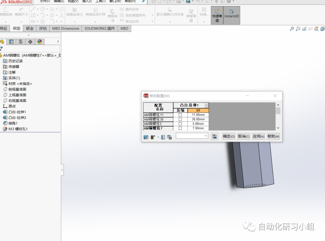 6.自制设计库,同一零件某个尺寸含多规格,如M3铜螺柱有5mm、6mm、7mm……等不同长度,如何做到一次建模形成多规格可复用零件,方法如下: