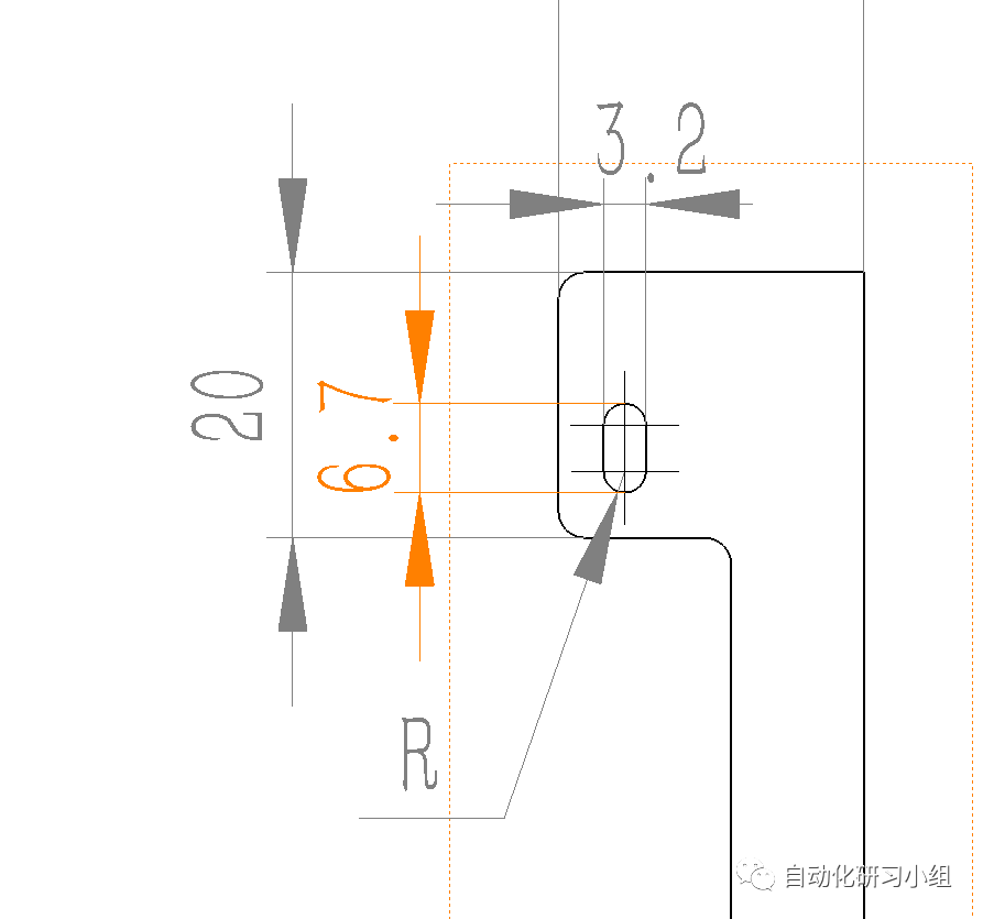 9.槽口最大尺寸标注,标注时按住shift键标注,槽口标注如下图,标长宽和半径R