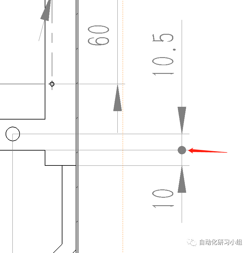 10.连续标注为使标注整洁使用圆点,鼠标指住箭头末端,指针变为一个箭头一条竖线后右键可在弹出的备选列表内选择