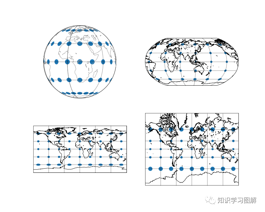 不同位置的变形椭圆形状差异很大,但面积大小差不多-等积投影。