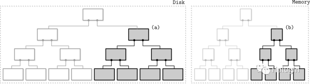 内存数据库树内容将部分刷新到磁盘上。在刷新期间,对于每个刷新的内存子树,我们在磁盘上找到相应的子树,并将内存数据库段和磁盘数据库子树的合并内容写到磁盘上的新段中。合并前的内存树和磁盘树如图1所示。