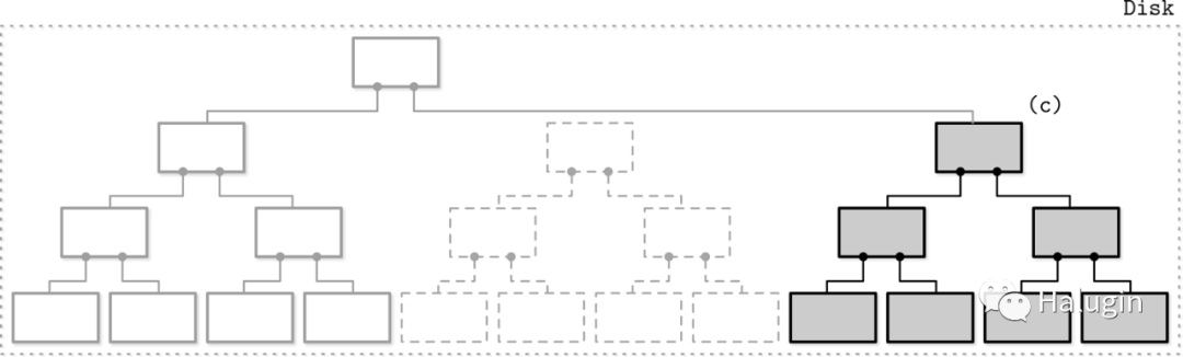 在刷新子树之后,被替换的内存数据库子树和磁盘数据库子树将被丢弃,并替换为它们的合并结果,从磁盘数据库树的现有部分可以寻址。图2显示了合并过程的结果,合并过程已经写入到磁盘的新位置,并附加到树的其余部分。