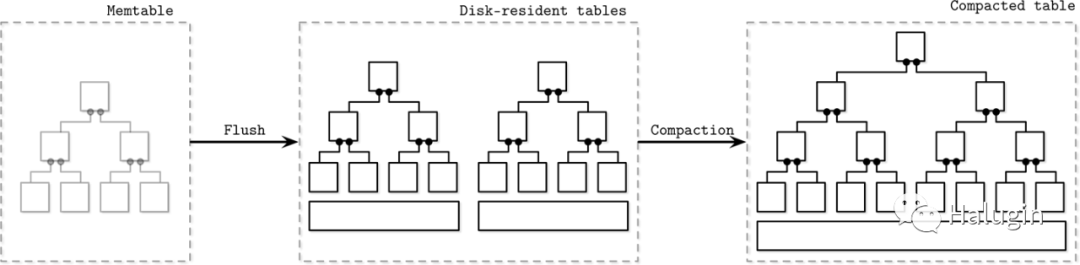 多组件LSM Tree数据生命周期如图3所示。数据首先在内存数据库组件中进行缓冲。当它变得太大时,它的内容会刷新到磁盘上,以创建磁盘数据库表。之后,将多个表合并在一起以创建更大的表。