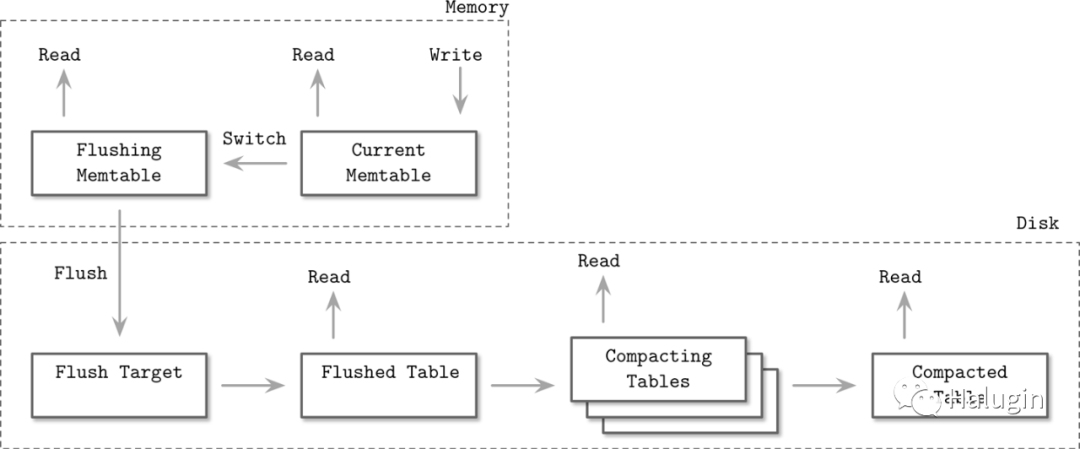 Memtable刷新可以周期性触发,也可以通过使用大小阈值触发。在可以刷新memtable之前,必须对它进行切换:分配一个新的memtable,它成为所有新写的目标,同时旧的memtable移动到刷新状态。这两个步骤必须以原子方式执行。刷新memtable在其内容被完全刷新之前,仍可用于读取。在此之后,旧的memtable将被丢弃,取而代之的是一个新写入的磁盘数据库表,该表可以用于读取。