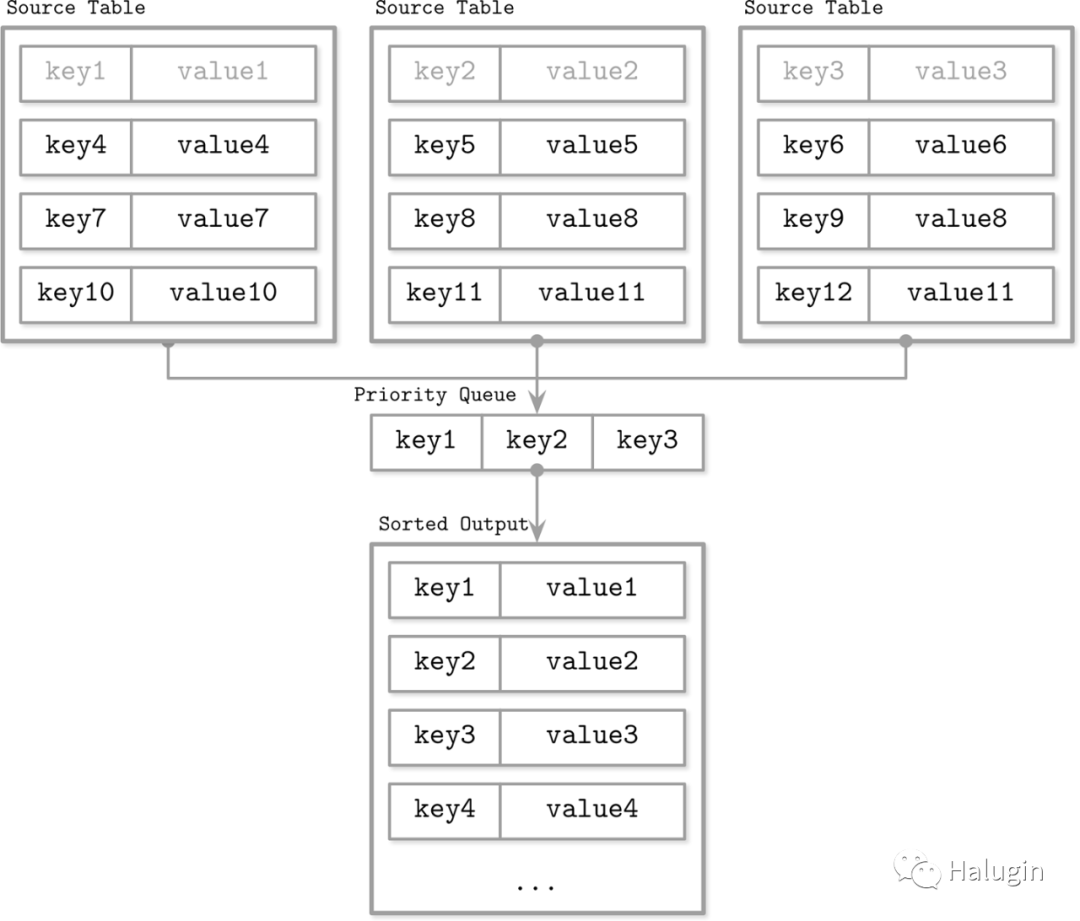 由于磁盘数据库表的内容是排序的,所以我们可以使用多路归并排序算法。例如,我们有三个源:两个磁盘数据库表和一个memtable。通常,存储引擎提供游标或迭代器来浏览文件内容。该游标保存上次使用的数据记录的偏移量,可以检查迭代是否已经完成,并可用于检索下一个数据记录。