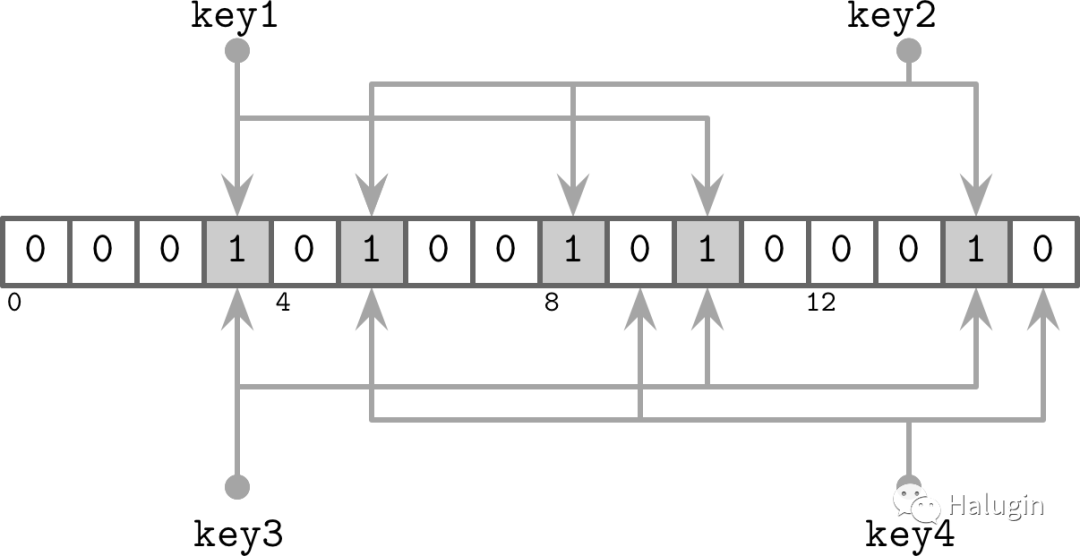 的位表示该键在集合中存在。在查找过程中,当在Bloom Filter中检查元素是否存在时,将再次计算该键的哈希函数,如果所有哈希函数确定的位为1