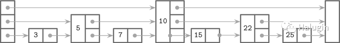 节点高度由一个随机函数决定,并在插入期间计算。具有相同高度的节点构成一个级别。关卡的数量是有上限的,以避免无限增长,最大高度是根据结构所能容纳的物品的数量来选择的。每一层的节点都呈指数级减少。