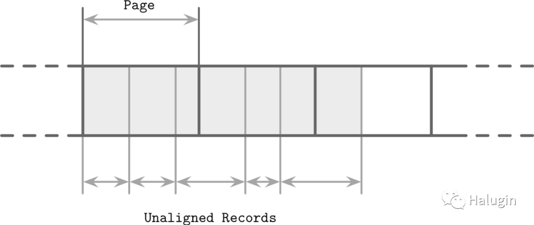 另一个区别是LSM树中的数据记录不一定是页面对齐的,指针可以使用绝对偏移量而不是页面id来实现寻址。在图9中,可以看到内容与磁盘块没有对齐的记录。有些记录跨越页面边界,需要在内存中加载多个页面。