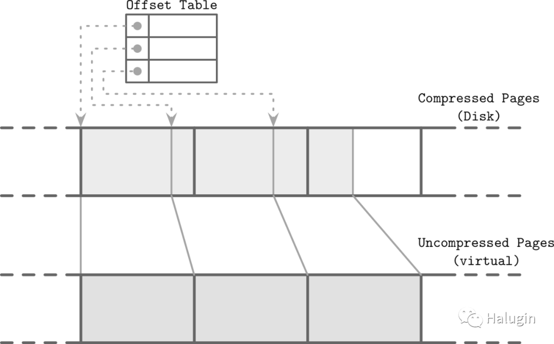 在压缩和刷新期间,压缩页会依次追加,压缩信息(原始未压缩页偏移量和实际压缩页偏移量)存储在单独的文件段中。在读取过程中,将查找压缩页偏移量及其大小,并在内存中对页进行解压缩和物化。
