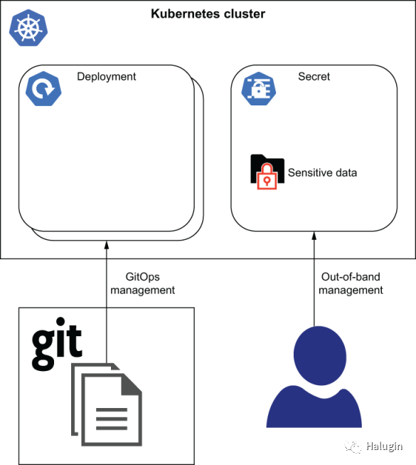在GitOps中处理Secret的第二个方法是管理完全脱离GitOps的secret。使用这种方法,除了Kubernetes Secrets之外的所有内容都将在Git中定义,并通过GitOps进行部署,但将使用一些其他机制来部署Secrets,即使它是手动的。