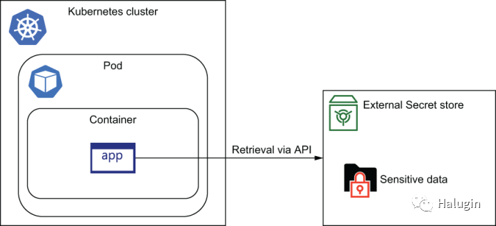 图4从外部Secret存储中检索Secret。在这种方法中,敏感数据不会以Kubernetes Secrets的形式存储。相反,它存储在外部系统中,由容器在运行时检索(例如通过API调用)。