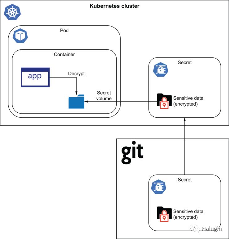 这种方法的一个优点是它将Git甚至Kubernetes本身从中移除。事实上,将Secret数据放入容器镜像后,映像可以在任何地方运行,而不仅仅是Kubernetes,并且不需要任何配置即可工作。