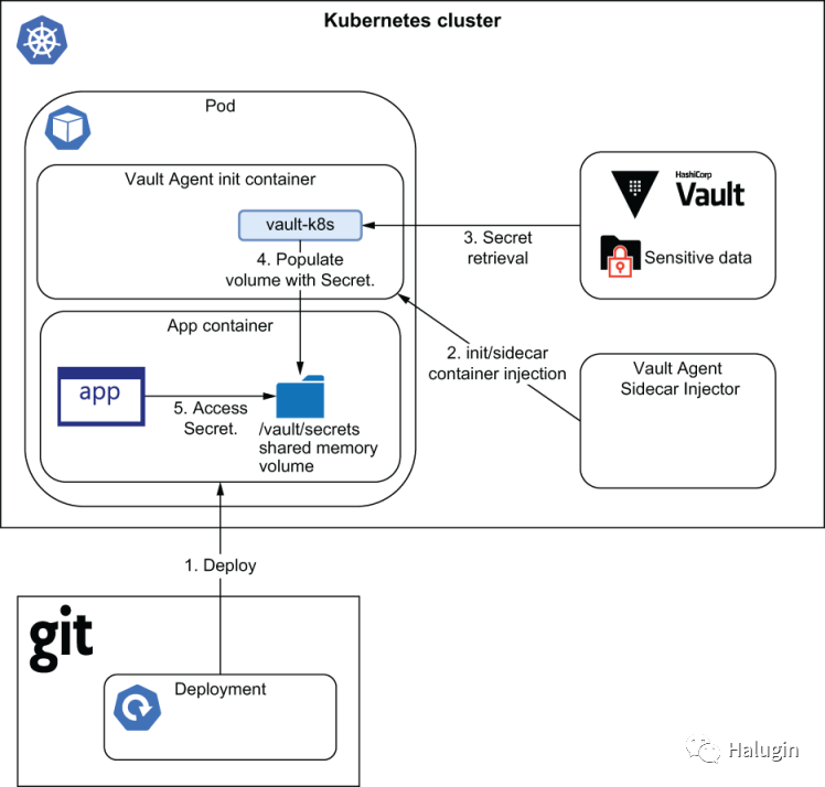 - Secret被写入共享内存卷,该卷在init容器和应用程序容器之间共享。