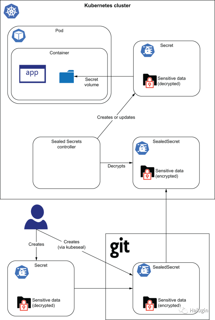 - 在集群中运行的一个控制器,负责解密一个SealedSecret,并使用解密的数据生成一个正常的Kubernetes Secret