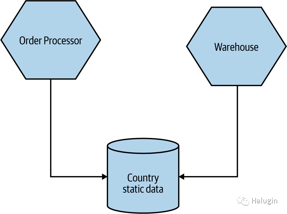 公共耦合的主要问题是,对数据结构的更改可能同时影响多个微服务。考虑图6中一些MusicCrop服务的示例。MusicCrop在世界各地都有业务,因此它需要有关其业务所在国的各种信息。这里,多个服务器都从共享数据库读取静态引用数据。如果该数据库的模式以向后不兼容的方式更改,则需要对数据库的每个使用者进行更改。在实际中,这样的共享数据往往很难更改。