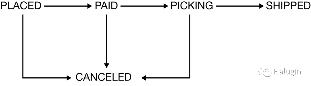 确保某种状态以正确的方式更改的一种方法是创建一个有限状态机。状态机可用于管理某些实体从一种状态到另一种状态的转换,确保禁止无效的状态转换。在图8中,可以看到MusicCorp中允许的订单状态转换。订单可以直接从PLACED