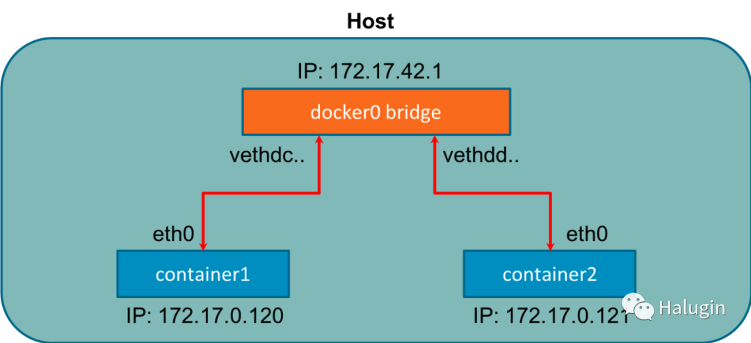 每个容器都可以通过docker0桥和容器端口到达另一个容器,因为它们在同一个docker主机和相同的网络上。docker主机有到容器ip地址的路由,以便通过其ip地址和端口到达容器。