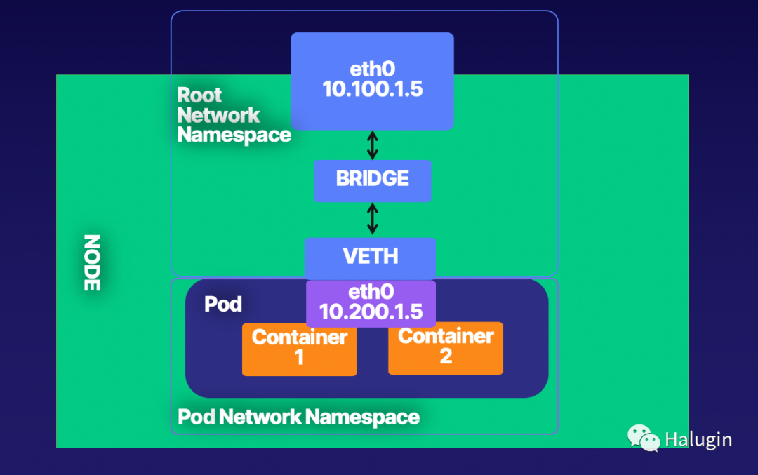 VETH (virtual Ethernet)设备是一个本端以太网隧道。VETH设备成对创建,如图1所示,其中pod看到的是VETH的eth0接口。在一对设备中,一台设备发送的报文会立即被另一台设备接收到。当其中一台设备down时,表示链路状态为down。可以使用brctl