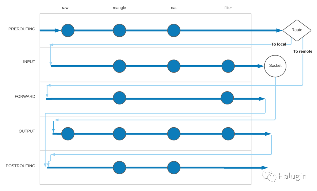 可以从流程图推断,对于任何给定的数据包,只有特定的netfilter钩子才会被调用。例如,来自本地进程的包总是触发NF_IP_LOCAL_OUT