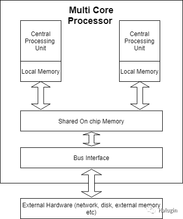 2001年,IBM推出了世界上第一个多核处理器,一个有两个cpu的芯片-参见图1的简化说明。如今,普通的笔记本都有8个cpu,也就是人们通常所说的核心。在多核芯片中,一个软件系统被构造成具有多个并行活动,可以在每个核上并发执行,增加可用核的数量。这样可以充分利用多核芯片上的处理资源,从而提高应用程序的处理能力。