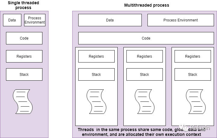 在你的系统中,你可以使用编程语言特性来创建和执行额外的线程。每个线程都是一个独立的执行序列,并且有自己的运行时堆栈来管理本地对象创建和方法调用。每个线程还可以访问进程的全局数据和环境。简单描述如图2所示。
