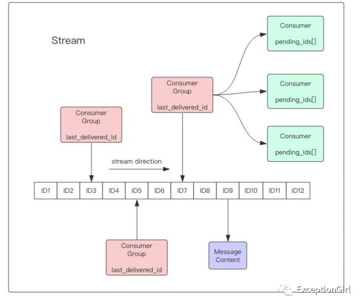 每个Stream都可以挂多个消费组,每个消费组会有个游标last_delivered_id在Stream数组之上往前移动,表示当前消费组已经消费到哪条消息了