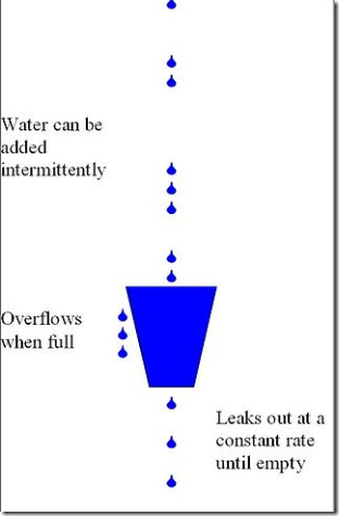 一个固定容量的漏桶,按照常量固定速率流出水滴; 如果桶是空的,则不需流出水滴; 可以以任意速率流入水滴到漏桶; 如果流入水滴超出了桶的容量,则流入的水滴溢出了(被丢弃),而漏桶容量是不变的。