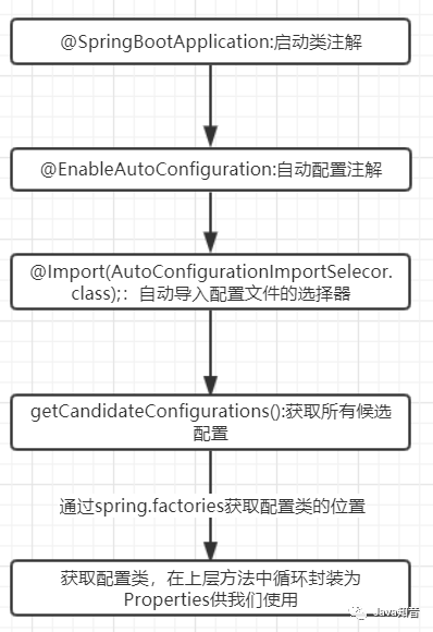 这个类会帮我们选择所有候选的配置,我们需要导入的配置都是SpringBoot帮我们写好的一个一个的配置类,那么这些配置类的位置,存在与META-INF/spring.factories文件中