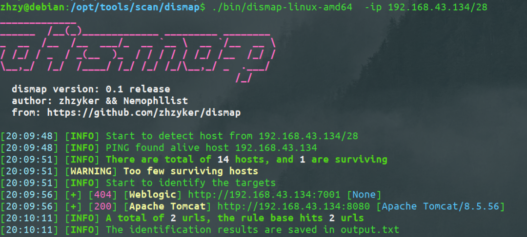 Dismap 默认会将扫描结果追加保存到 output.txt ,大致这个样子: