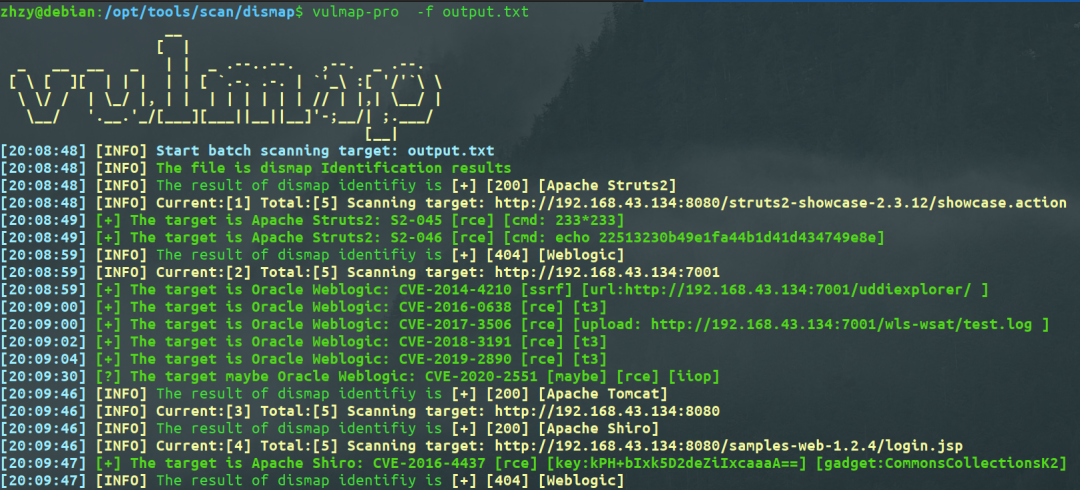 ###### dismap 0.1 output file ############ asset discovery and identification tools ############ by:https://github.com/zhzyker/dismap ######[+] [200] [Apache Struts2] { http://192.168.43.134:8080/struts2-showcase-2.3.12/showcase.action } [Struts2 Showcase][+] [404] [Weblogic] { http://192.168.43.134:7001 } [None][-] [404] { http://192.168.43.134:8080/fast/ } [HTTP Status 404 – Not Found][+] [200] [Apache Tomcat] { http://192.168.43.134:8080 } [Apache Tomcat/8.5.56][+] [200] [Apache Shiro] { http://192.168.43.134:8080/samples-web-1.2.4/login.jsp } [None]