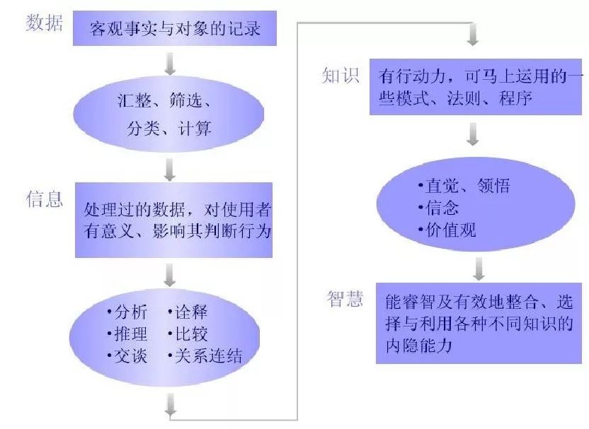 信息虽然给出数据内一些有意义的东西,但其价值往往随着时间流逝开始衰减,只有通过人们的参与对信息进行归纳、演绎、比较等手段进行挖掘,是其有价值的的部分沉淀下来,并于已存在的人类知识体系相结合,这部分有价值的信息就转化为知识。知识,相比于数据或信息更接近行动,是可以用来决策和指导行动的。