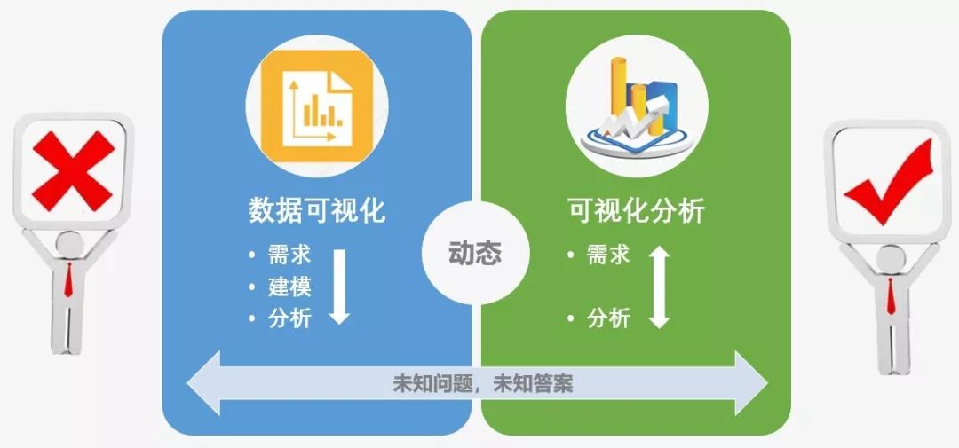 如图中所示,之前的数据分析,是以左侧的“数据可视化”为主要方式;而现在更多转变为右侧的“可视化分析”。