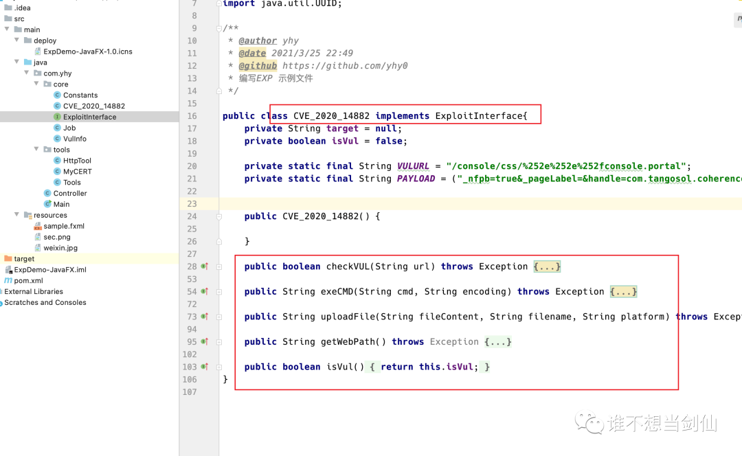 .├── ExpDemo-JavaFX.iml├── pom.xml maven工程的基本文件└── src└── main├── deploy│ └── ExpDemo-JavaFX-1.0.icns├── java│ └── com│ └── yhy│ ├── Controller.java 控制JavaFX图形化界面的各种显示、事件等,核心代码│ ├── Main.java JavaFX 应用程序的入口│ ├── core 核心代码文件夹│ │ ├── CVE_2020_14882.java exp编写示例│ │ ├── Constants.java 一些常量信息│ │ ├── ExploitInterface.java exp 编写要实现的接口│ │ ├── Job.java 批量检查的线程池│ │ └── VulInfo.java 映射批量检查界面中的表格,信息基本类│ └── tools 工具文件夹│ ├── HttpTool.java HTTP 请求封装│ ├── MyCERT.java HTTPS 请求证书设置│ └── Tools.java 一些处理函数└── resources 资源文件夹├── sample.fxml JavaFX图形化界面描述文件├── sec.png└── weixin.jpg