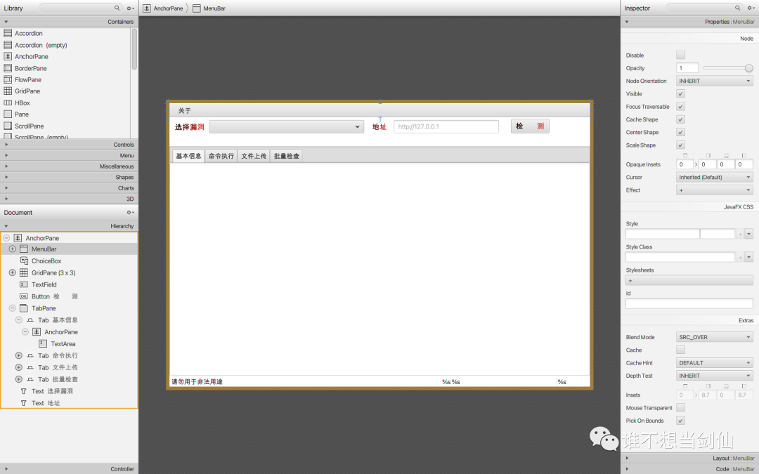 想添加什么控件,直接从Scene Builder的左边控件栏中拖拽一个到界面设计区域,然后只需要关心右侧栏第三个Code