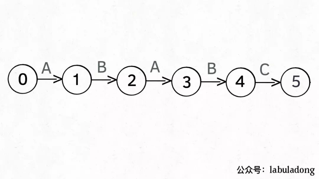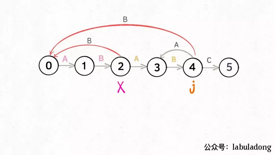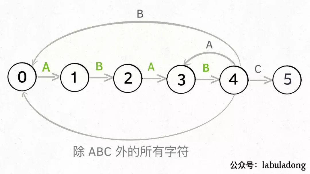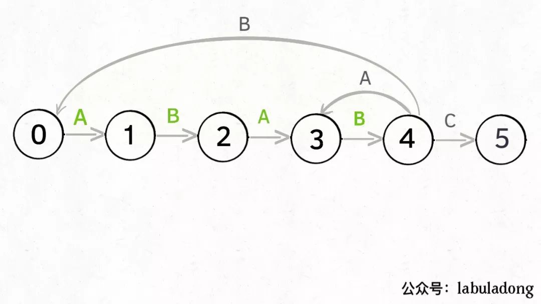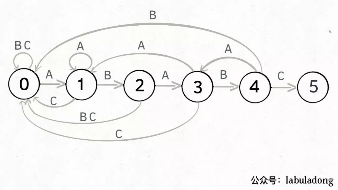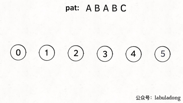 如上图,圆圈内的数字就是状态,状态 0 是起始状态,状态 5(pat.length