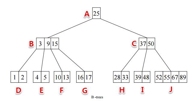 4. 在一个节点中,第n个子树中的所有key,小于这个节点中第n个key,大于第n-1个key,比如上图中B节点的第2个子节点E中的所有key都小于B中的第2个key 9,大于第1个key 3;